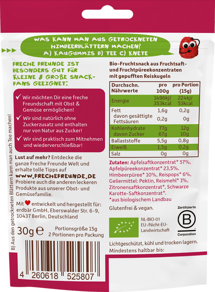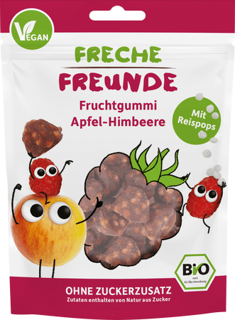 • Freche Freunde Bio Żelki o smaku jabłka i maliny z chrupkami ryżowymi to organiczna, wegańska i bezglutenowa przekąska dla dzieci powyżej 12. miesiąca życia, bez dodatku cukru.