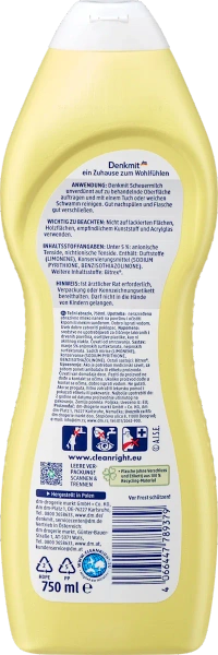 - Denkmit Mleczko Czyszczące o świeżym cytrusowym zapachu skutecznie usuwa uporczywe zabrudzenia w kuchni i łazience, nie powodując zarysowań. Idealne do różnych powierzchni, zapewnia lśniącą czystość i przyjemny aromat.