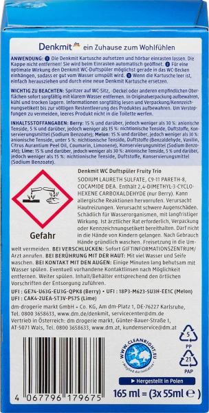 - Denkmit Kostka WC Fruity Trio zapewnia długotrwałą owocową świeżość i higieniczną czystość toalety dzięki unikalnej mieszance trzech zapachów.