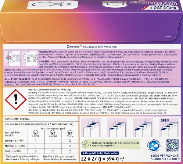 - Denkmit Kapsułki do Prania Kolorowych 3w1 Aktywne skutecznie usuwają plamy, chronią kolory i pielęgnują tkaniny. Produkt wegański z dodatkiem Bitrex dla bezpieczeństwa dzieci.