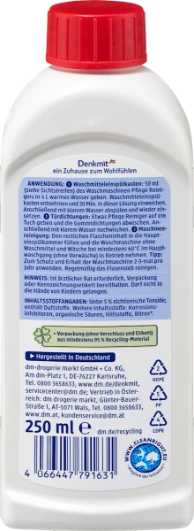 Denkmit Płyn do Czyszczenia Pralek skutecznie usuwa kamień, osady i nieprzyjemne zapachy, zapewniając higieniczną czystość Twojej pralki. Dociera do trudno dostępnych miejsc, takich jak bęben, grzałka, szuflada na detergenty i przewody, przedłużając żywotność urządzenia oraz poprawiając efektywność prania.