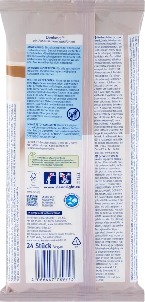 - Wilgotne chusteczki do mebli z olejkiem pielęgnacyjnym, skutecznie usuwające kurz i zabrudzenia, z formułą antystatyczną zapobiegającą osadzaniu się kurzu.