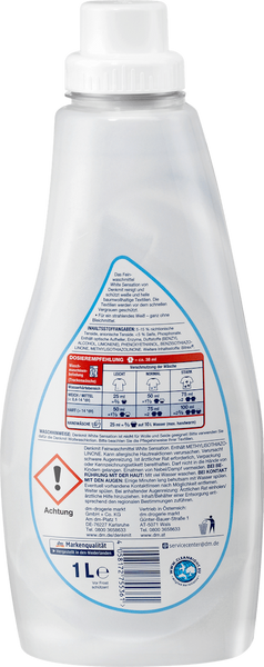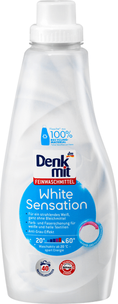 Denkmit Plyn do prania bialych tkanin White Sensation skutecznie czysci i chroni biale oraz jasne tkaniny zawierajace bawelne. Specjalna formula zapobiega szybkiemu szarzeniu tkanin, dzieki czemu odziez dluzej zachowuje swiezosc i jasnosc. Plyn jest odpowiedni do prania zarowno w pralce, jak i recznego, w temperaturach od 30°C do 60°C.