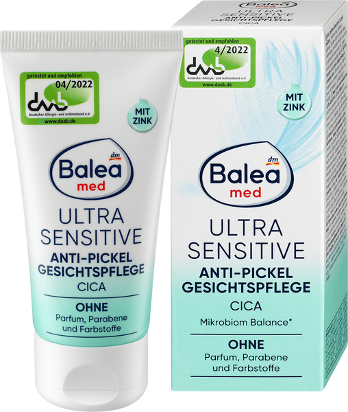 - Balea Med Ultra Sensitive Krem Przeciwtrądzikowy z Cica i Cynkiem to lekki krem do codziennej pielęgnacji skóry wrażliwej i skłonnej do niedoskonałości. Zawiera składniki łagodzące i regenerujące, nie zawiera parabenów, barwników ani substancji zapachowyc