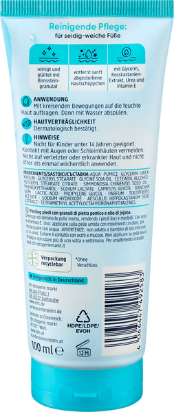 Skład: Aqua, Pumice, Glycerin, Urea, Kaolin, Glyceryl Stearate, Glycine Soja Oil, Cetearyl Alcohol, Glyceryl Stearate Citrate, Simmondsia Chinensis Seed Oil, Phenoxyethanol, Sodium Lactate, Caprylyl Glycol, Xanthan Gum, Lactic Acid, Propylene Glycol, Parfum, Sodium Hydroxide, Tocopheryl Acetate, Aesculus Hippocastanum Seed Extract.