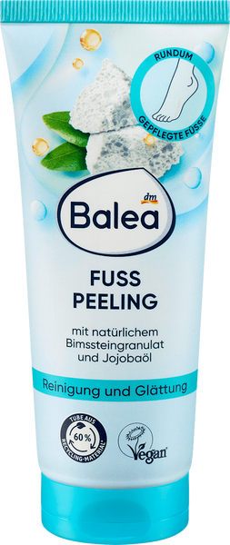 - Balea Peeling do stóp z naturalnym pumeksem i olejkiem jojoba skutecznie usuwa martwy naskórek, intensywnie nawilża i regeneruje skórę stóp, pozostawiając ją gładką i odświeżoną.