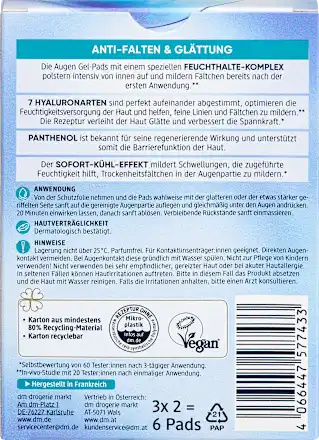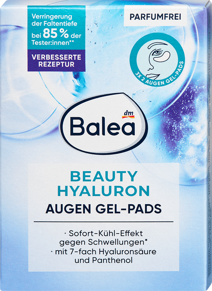 • Balea Beauty Hyaluron to żelowe płatki pod oczy, które intensywnie nawilżają, redukują opuchliznę i wygładzają drobne zmarszczki. Zawierają kwas hialuronowy, pantenol oraz ekstrakty z jabłka i konjaku, przywracając skórze świeżość i elastyczność.