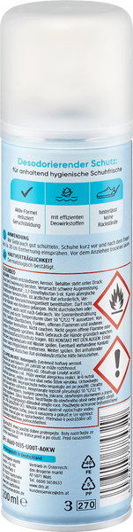 Sposób Użycia: Przed użyciem wstrząsnąć. Rozpylić równomiernie wewnątrz obuwia z odległości około 20 cm. Pozostawić do wyschnięcia przed założeniem butów. W razie potrzeby powtórzyć aplikację.