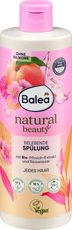 • Odżywka Balea Natural Beauty Belebend z ekstraktem z brzoskwini i wodą ryżową nawilża i wzmacnia włosy, poprawiając ich elastyczność i ułatwiając rozczesywanie. Formuła bez silikonów, odpowiednia do codziennego stosowania.