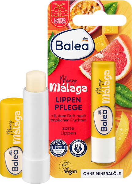 - Naturalna pomadka do ust Balea Mango Malaga intensywnie nawilża i regeneruje usta dzięki zawartości masła shea, oleju kokosowego i awokado. Wzbogacona o witaminę E, chroni przed szkodliwymi czynnikami zewnętrznymi, pozostawiając usta miękkie i gładkie.