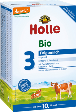 Holle BIO Folgemilch 3 to pełnowartościowe mleko następne stworzone z myślą o dzieciach po 10. miesiącu życia. Powstaje na bazie wysokiej jakości mleka w standardzie Demeter z południowych Niemiec, a jego skład został opracowany tak, aby wspierać zbilansowaną dietę malucha na etapie łączenia posiłków z butelki z daniami stałymi. Formuła zawiera roślinne DHA z mikroalg oraz witaminę D – składniki ważne m.in. dla prawidłowego rozwoju i funkcjonowania organizmu zgodnie z przepisami dotyczącymi żywności dla szczególnych grup.